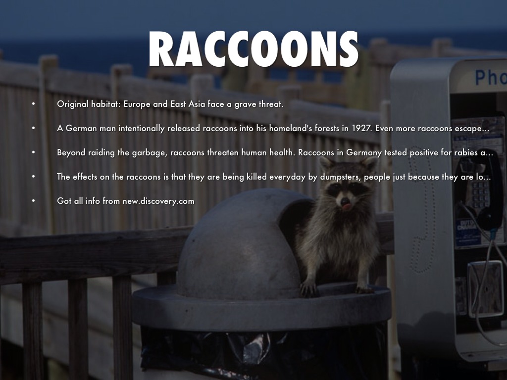 • The effects on the raccoons is that they are being killed everyday by dumpsters, people just because they are looking for food. I know they are dangerous but where ever they go they will also face danger.