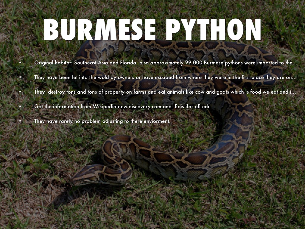 • Original habitat: Southeast Asia and Florida also approximately 99,000 Burmese pythons were imported to the United States between 1996 and 2006 (compared to only 17,000 between 1970 and 1995).