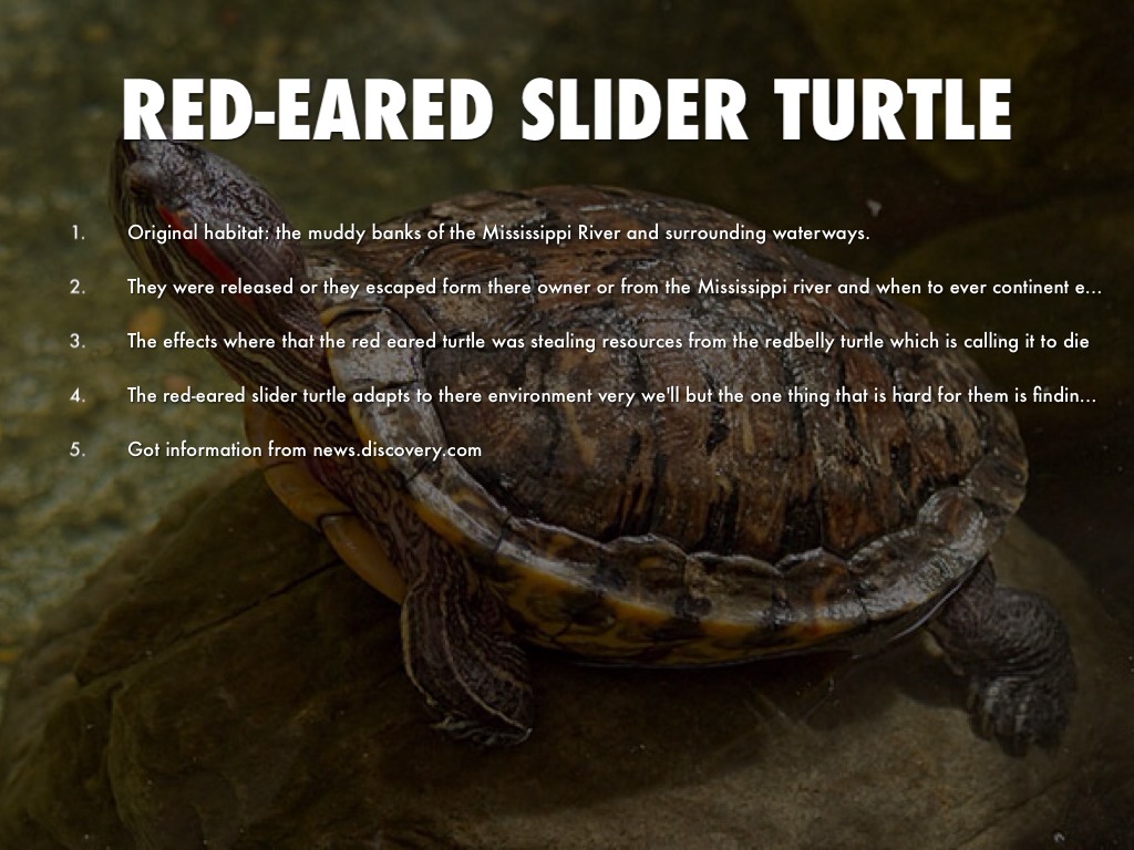• The red-eared slider turtle adapts to there environment very we'll but the one thing that is hard for them is finding a new home. Otherwise they are have no problem.