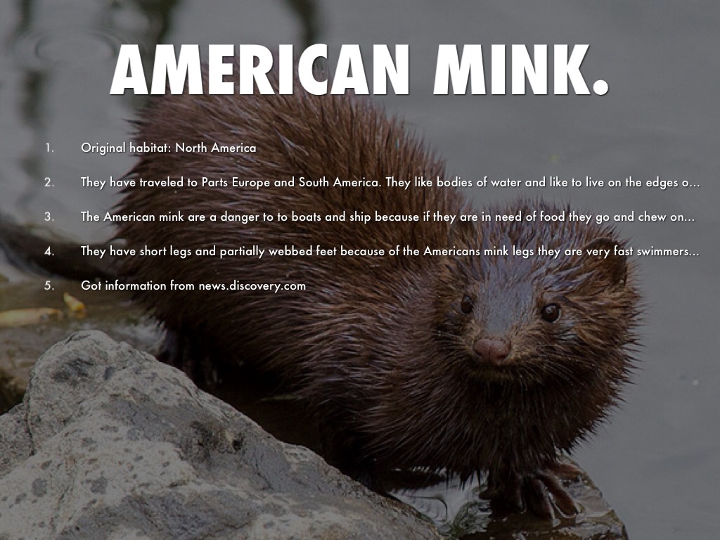 • The American mink are a danger to to boats and ship because if they are in need of food they go and chew on the wires which can start fires and delay important things that's cross the ocean or lakes.