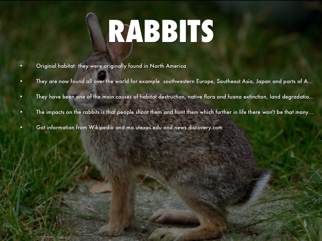 • The impacts on the rabbits is that people shoot them and hunt them which further in life there won't be that many rabbits they are always in danger ether by a predator to getting hit by a car where ever they go.