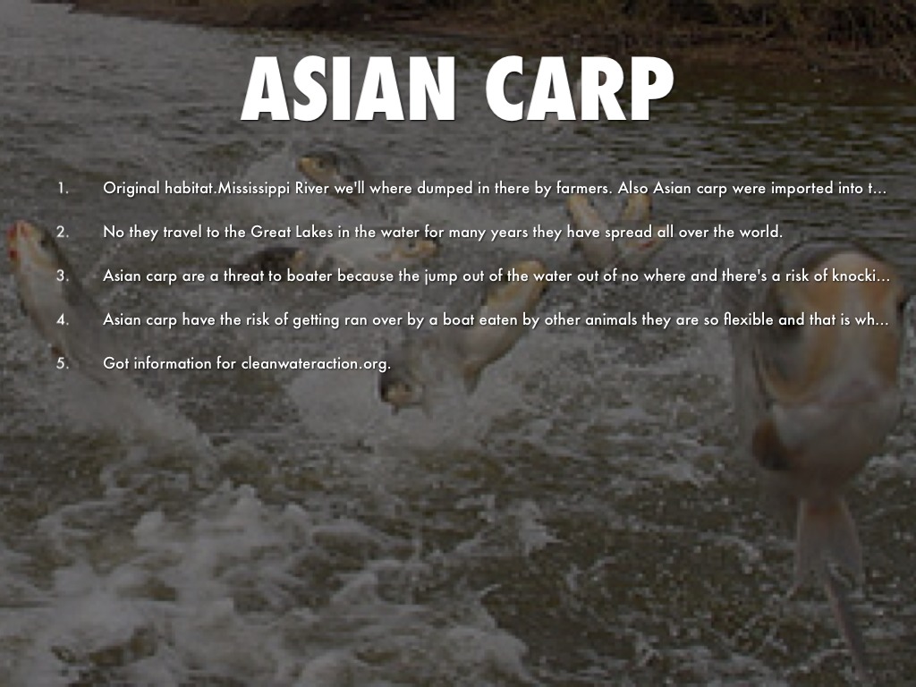 • Asian carp are a threat to boater because the jump out of the water out of no where and there's a risk of knocking the boater into the water causing death or other injuries they have wicked smacks with there tales they can hurt almost any human which is a problem.