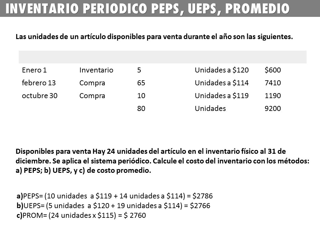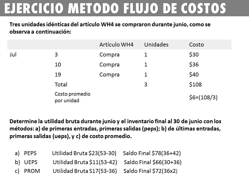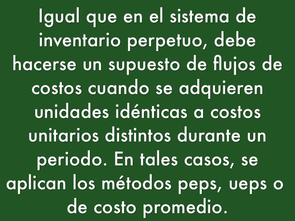 Igual que en el sistema de inventario perpetuo, debe hacerse un supuesto de flujos de costos cuando se adquieren unidades idénticas a costos unitarios distintos durante un periodo. En tales casos, se aplican los métodos peps, ueps o de costo promedio.