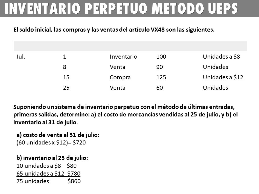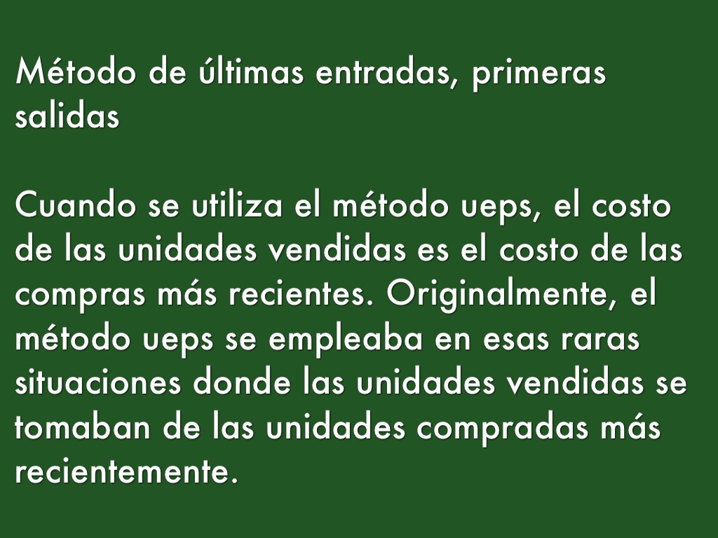 Cuando se utiliza el método ueps, el costo de las unidades vendidas es el costo de las compras más recientes. Originalmente, el método ueps se empleaba en esas raras situaciones donde las unidades vendidas se tomaban de las unidades compradas más recientemente.