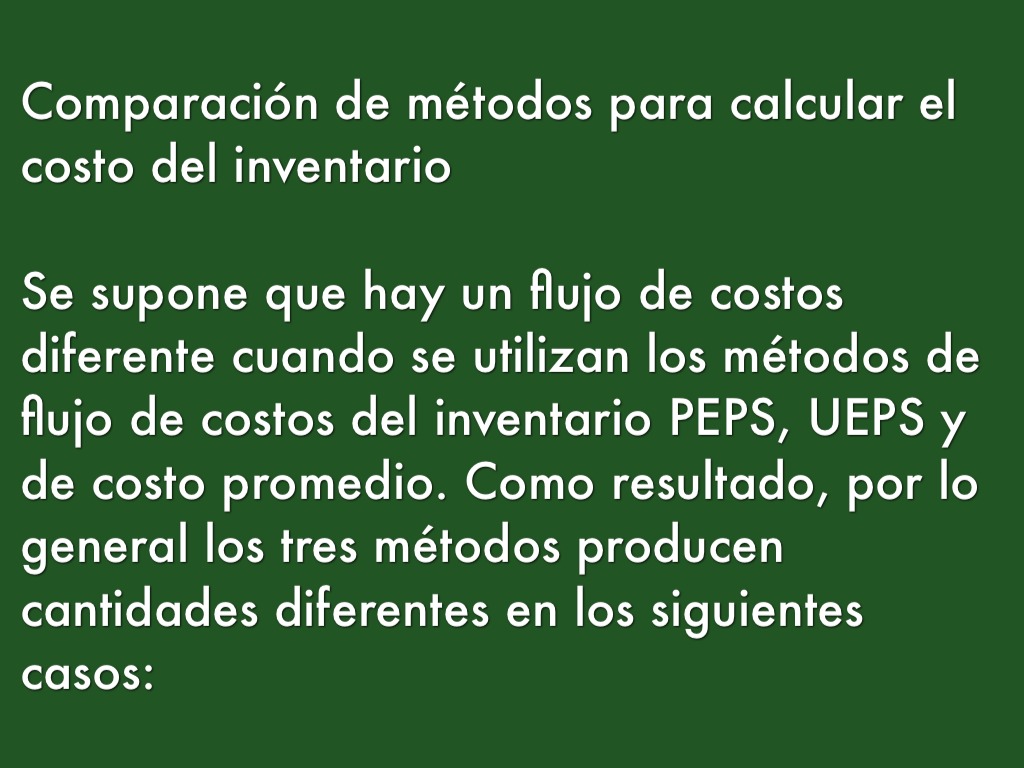 Se supone que hay un flujo de costos diferente cuando se utilizan los métodos de flujo de costos del inventario PEPS, UEPS y de costo promedio. Como resultado, por lo general los tres métodos producen cantidades diferentes en los siguientes casos: