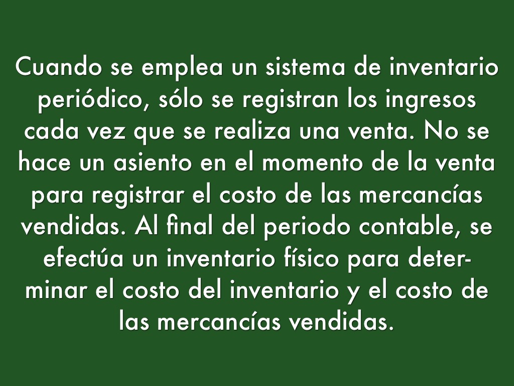 Cuando se emplea un sistema de inventario periódico, sólo se registran los ingresos cada vez que se realiza una venta. No se hace un asiento en el momento de la venta para registrar el costo de las mercancías vendidas. Al final del periodo contable, se efectúa un inventario físico para deter- minar el costo del inventario y el costo de las mercancías vendidas.