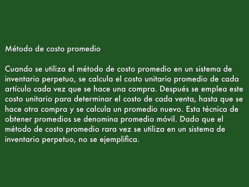Cuando se utiliza el método de costo promedio en un sistema de inventario perpetuo, se calcula el costo unitario promedio de cada artículo cada vez que se hace una compra. Después se emplea este costo unitario para determinar el costo de cada venta, hasta que se hace otra compra y se calcula un promedio nuevo. Esta técnica de obtener promedios se denomina promedio móvil. Dado que el método de costo promedio rara vez se utiliza en un sistema de inventario perpetuo, no se ejemplifica.