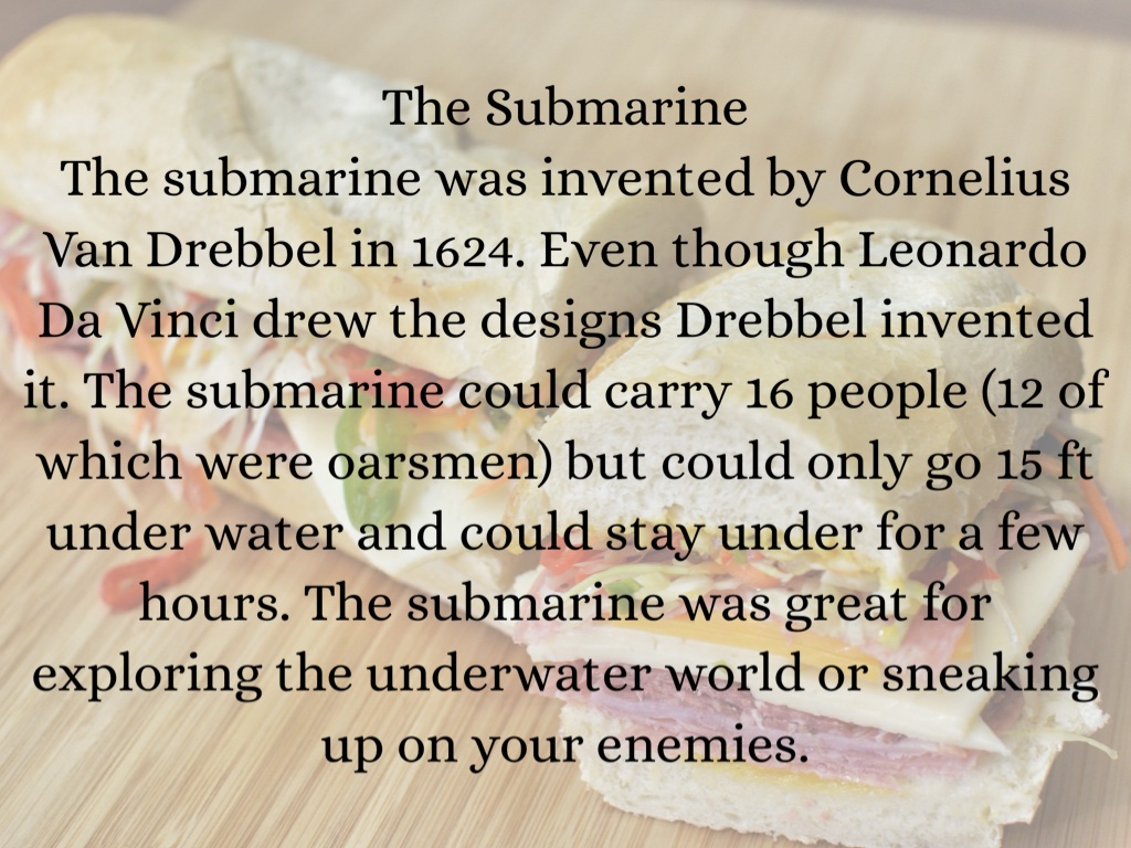 The submarine was invented by Cornelius Van Drebbel in 1624. Even though Leonardo Da Vinci drew the designs Drebbel invented it. The submarine could carry 16 people (12 of which were oarsmen) but could only go 15 ft under water and could stay under for a few hours. The submarine was great for exploring the underwater world or sneaking up on your enemies.