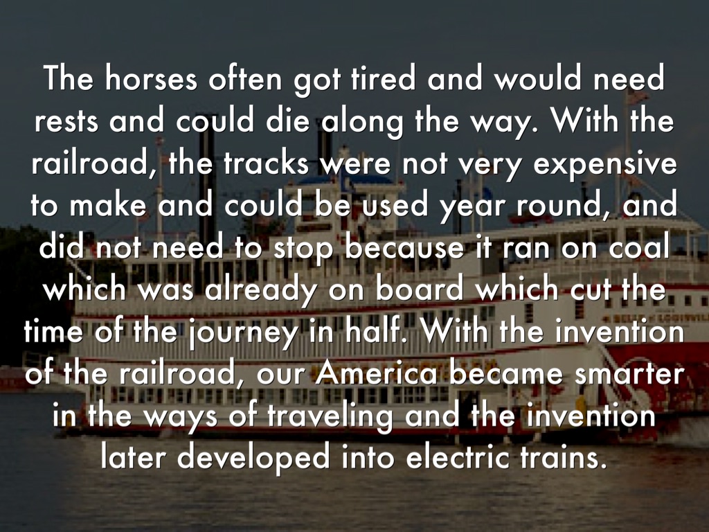 The horses often got tired and would need rests and could die along the way. With the railroad, the tracks were not very expensive to make and could be used year round, and did not need to stop because it ran on coal which was already on board which cut the time of the journey in half. With the invention of the railroad, our America became smarter in the ways of traveling and the invention later developed into electric trains.