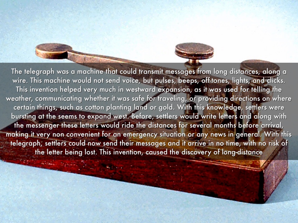 The telegraph was a machine that could transmit messages from long distances, along a wire. This machine would not send voice, but pulses, beeps, off-tones, lights, and clicks. This invention helped very much in westward expansion, as it was used for telling the weather, communicating whether it was safe for traveling, or providing directions on where certain things, such as cotton planting land or gold. With this knowledge, settlers were bursting at the seems to expand west. Before, settlers would write letters and along with the messenger these letters would ride the distances for several months before arrival, making it very non convenient for an emergency situation or any news in general. With this telegraph, settlers could now send their messages and it arrive in no time, with no risk of the letter being lost. This invention, caused the discovery of long-distance