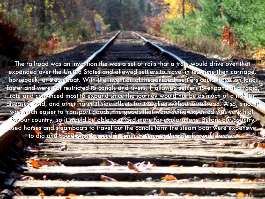 The railroad was an invention the was a set of rails that a train would drive over that expanded over the United States and allowed settlers to travel in less time then carriage, horseback, or steamboat. With the invention of the railroad, settlers could travel on land faster and were not restricted to canals and rivers. It allowed settlers to expand at a rapid rate and convinced most to expand since the journey would not be as much of a risk for diseases, cold, and other harmful side effects for traveling without a railroad. Also, since it was much easier to transport goods, the goods that were being exported was very high for our country, so it would be able to afford more for explorations. Before our country used horses and steamboats to travel but the canals form the steam boat were expensive to dig and could on,h be used in summer time, or the canals would freeze.