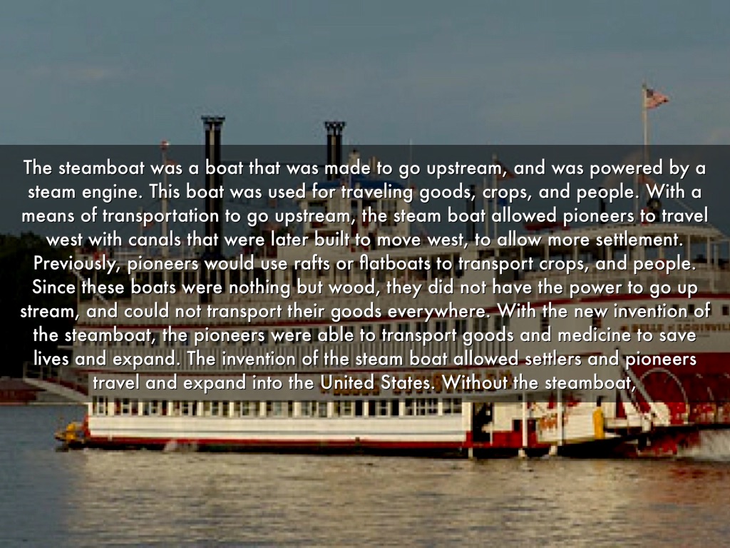 The steamboat was a boat that was made to go upstream, and was powered by a steam engine. This boat was used for traveling goods, crops, and people. With a means of transportation to go upstream, the steam boat allowed pioneers to travel west with canals that were later built to move west, to allow more settlement. Previously, pioneers would use rafts or flatboats to transport crops, and people. Since these boats were nothing but wood, they did not have the power to go up stream, and could not transport their goods everywhere. With the new invention of the steamboat, the pioneers were able to transport goods and medicine to save lives and expand. The invention of the steam boat allowed settlers and pioneers travel and expand into the United States. Without the steamboat,