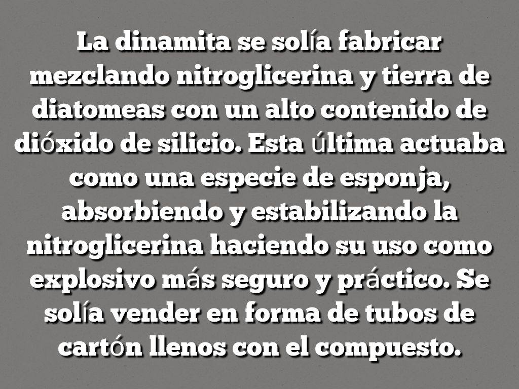 La dinamita se solía fabricar mezclando nitroglicerina y tierra de diatomeas con un alto contenido de dióxido de silicio. Esta última actuaba como una especie de esponja, absorbiendo y estabilizando la nitroglicerina haciendo su uso como explosivo más seguro y práctico. Se solía vender en forma de tubos de cartón llenos con el compuesto.