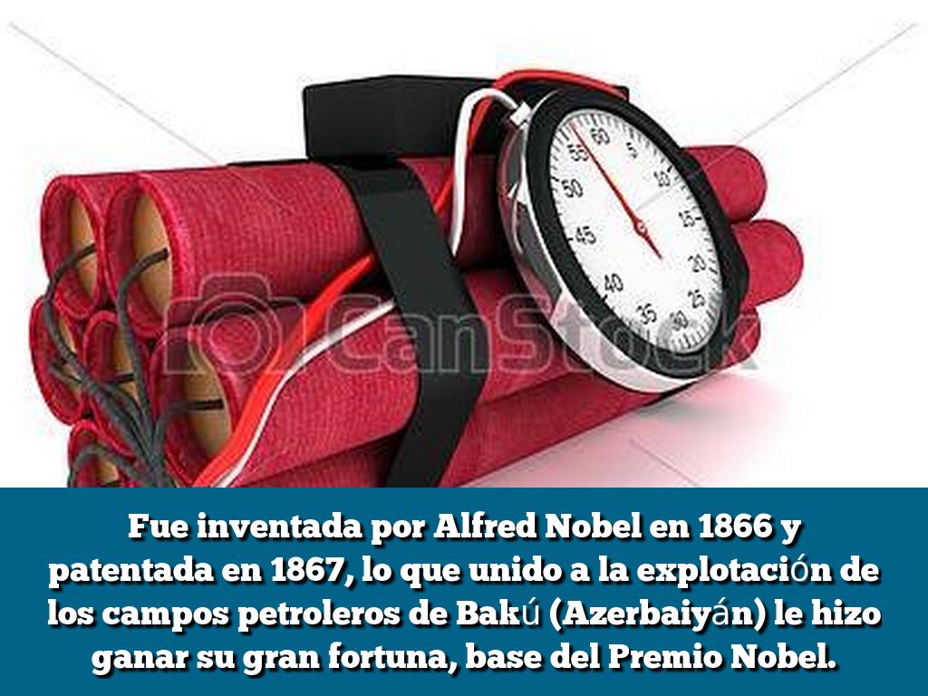 Fue inventada por Alfred Nobel en 1866 y patentada en 1867, lo que unido a la explotación de los campos petroleros de Bakú (Azerbaiyán) le hizo ganar su gran fortuna, base del Premio Nobel.