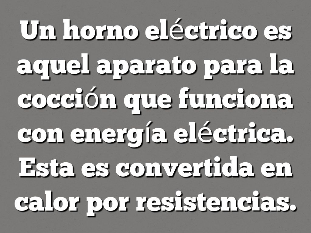 Un horno eléctrico es aquel aparato para la cocción que funciona con energía eléctrica. Esta es convertida en calor por resistencias.