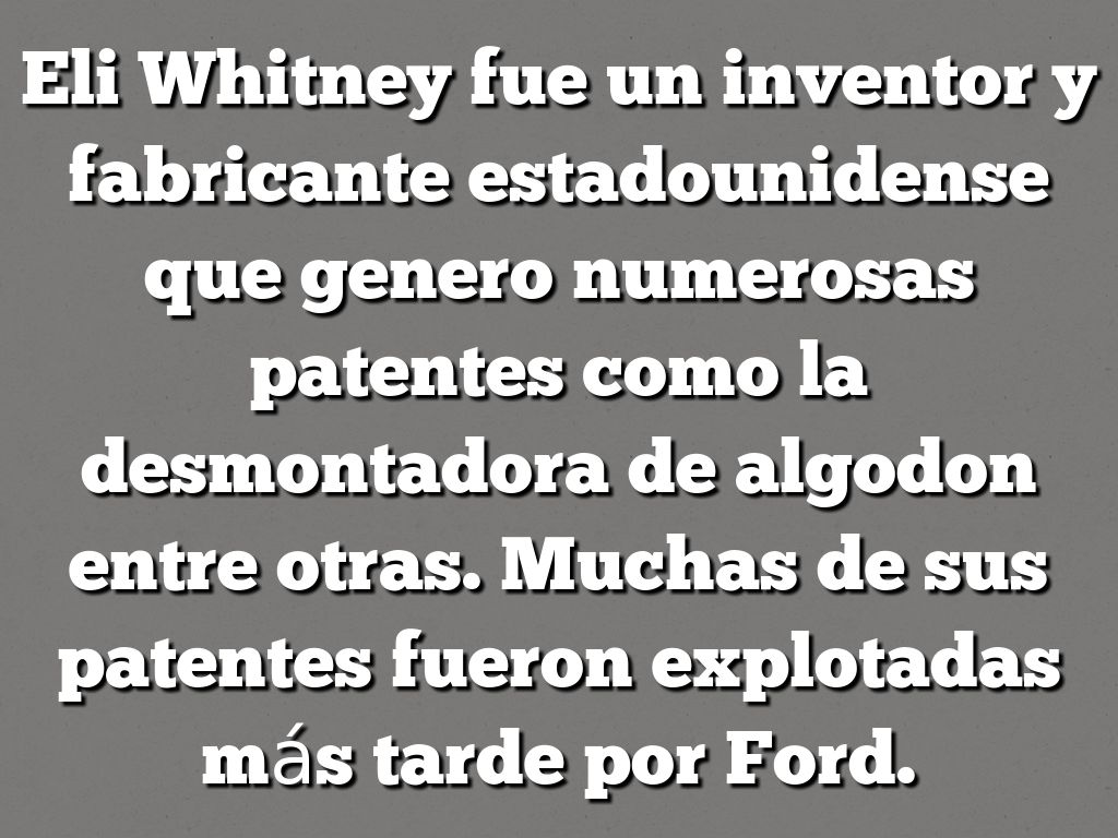 Eli Whitney fue un inventor y fabricante estadounidense que genero numerosas patentes como la desmontadora de algodon entre otras. Muchas de sus patentes fueron explotadas más tarde por Ford.