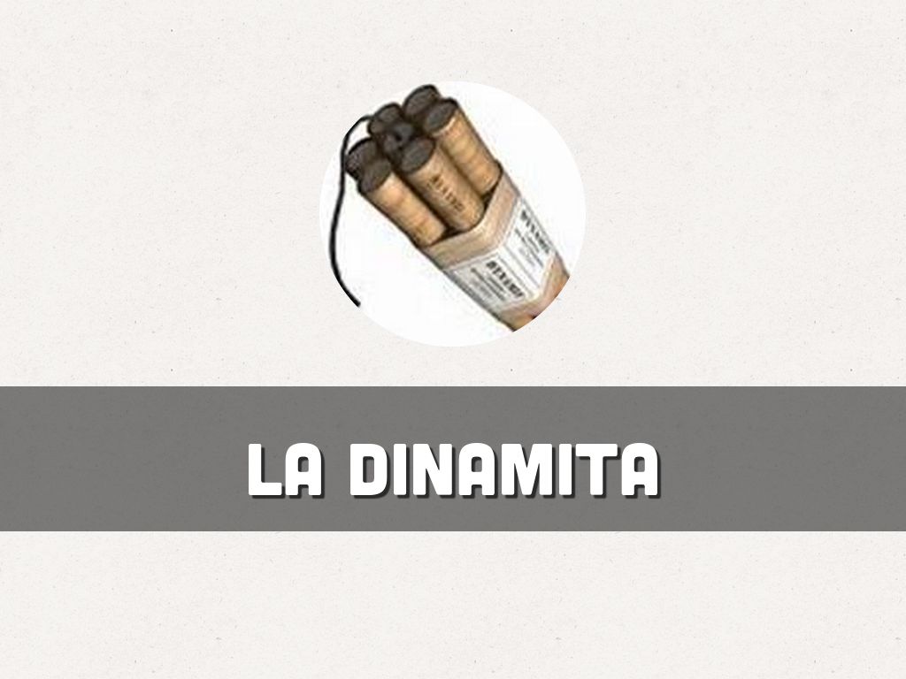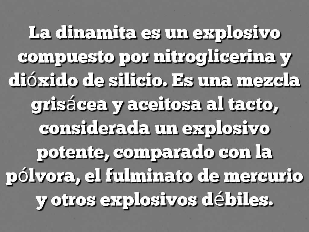 La dinamita es un explosivo compuesto por nitroglicerina y dióxido de silicio. Es una mezcla grisácea y aceitosa al tacto, considerada un explosivo potente, comparado con la pólvora, el fulminato de mercurio y otros explosivos débiles.