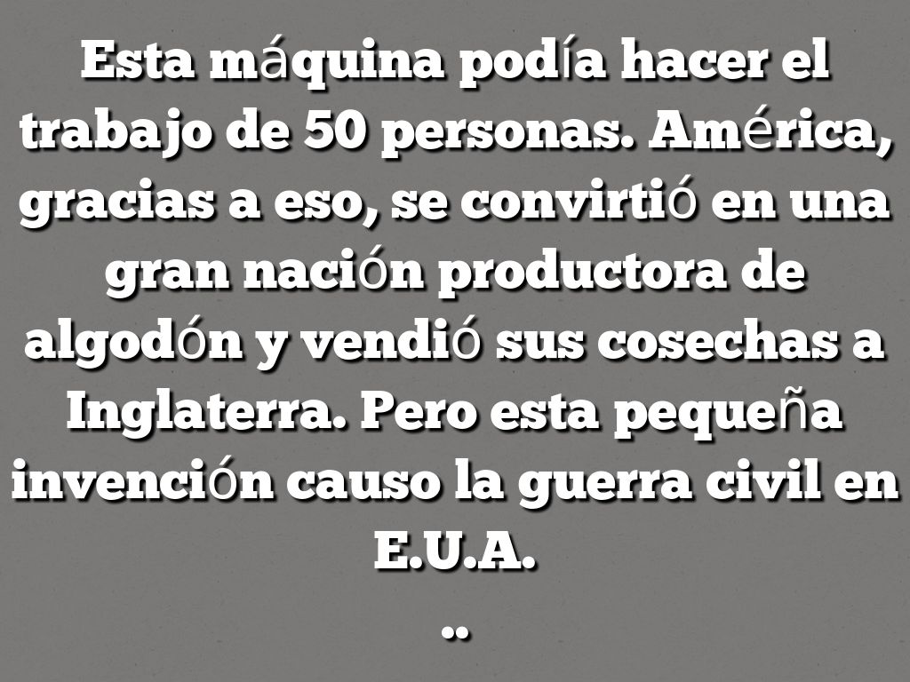 Esta máquina podía hacer el trabajo de 50 personas. América, gracias a eso, se convirtió en una gran nación productora de algodón y vendió sus cosechas a Inglaterra. Pero esta pequeña invención causo la guerra civil en E.U.A.