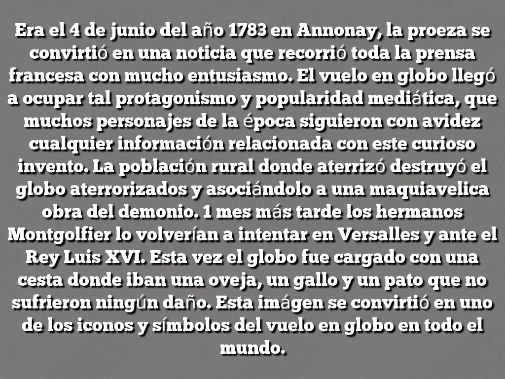 Era el 4 de junio del año 1783 en Annonay, la proeza se convirtió en una noticia que recorrió toda la prensa francesa con mucho entusiasmo. El vuelo en globo llegó a ocupar tal protagonismo y popularidad mediática, que muchos personajes de la época siguieron con avidez cualquier información relacionada con este curioso invento. La población rural donde aterrizó destruyó el globo aterrorizados y asociándolo a una maquiavelica obra del demonio. 1 mes más tarde los hermanos Montgolfier lo volverían a intentar en Versalles y ante el Rey Luis XVI. Esta vez el globo fue cargado con una cesta donde iban una oveja, un gallo y un pato que no sufrieron ningún daño. Esta imágen se convirtió en uno de los iconos y símbolos del vuelo en globo en todo el mundo.
