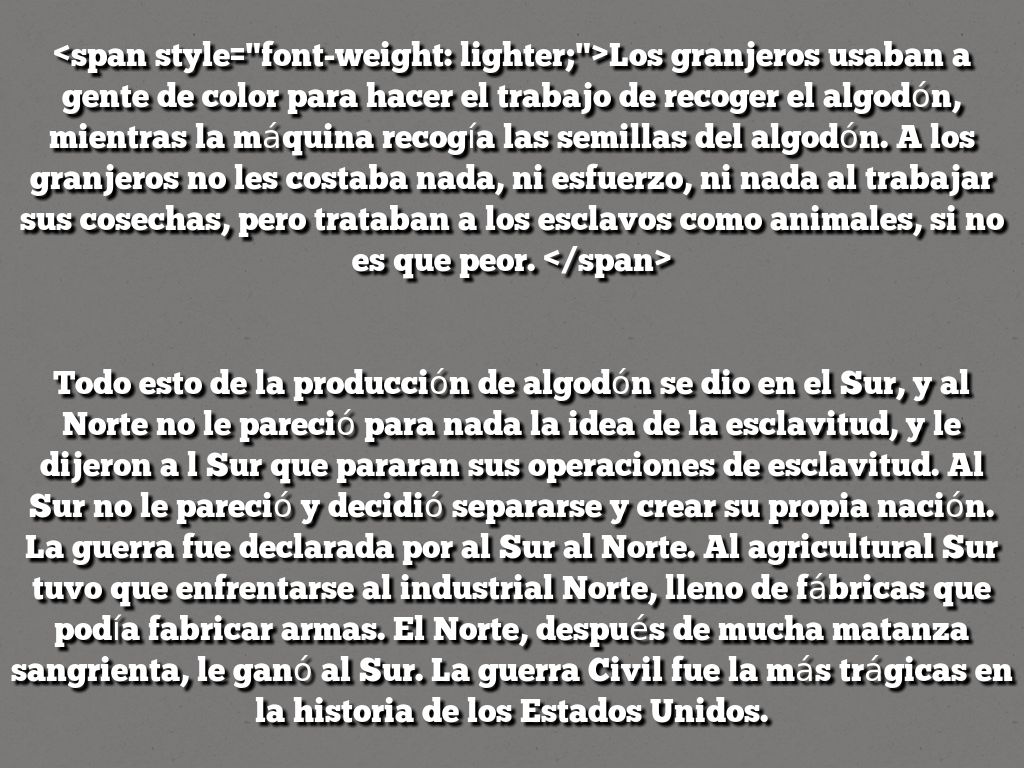 Los granjeros usaban a gente de color para hacer el trabajo de recoger el algodón, mientras la máquina recogía las semillas del algodón. A los granjeros no les costaba nada, ni esfuerzo, ni nada al trabajar sus cosechas, pero trataban a los esclavos como animales, si no es que peor.