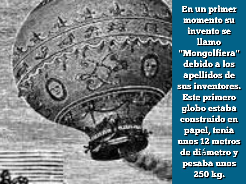 En un primer momento su invento se llamo "Mongolfiera" debido a los apellidos de sus inventores. Este primero globo estaba construido en papel, tenia unos 12 metros de diámetro y pesaba unos 250 kg.