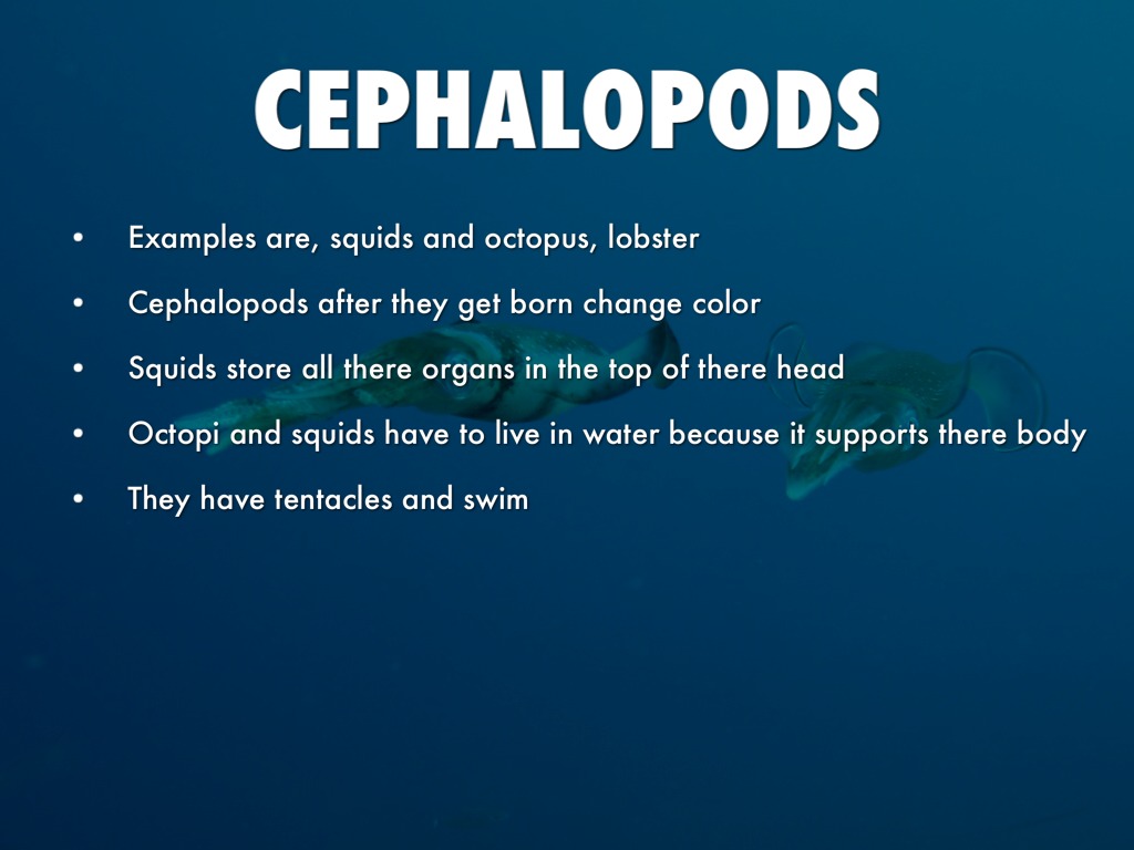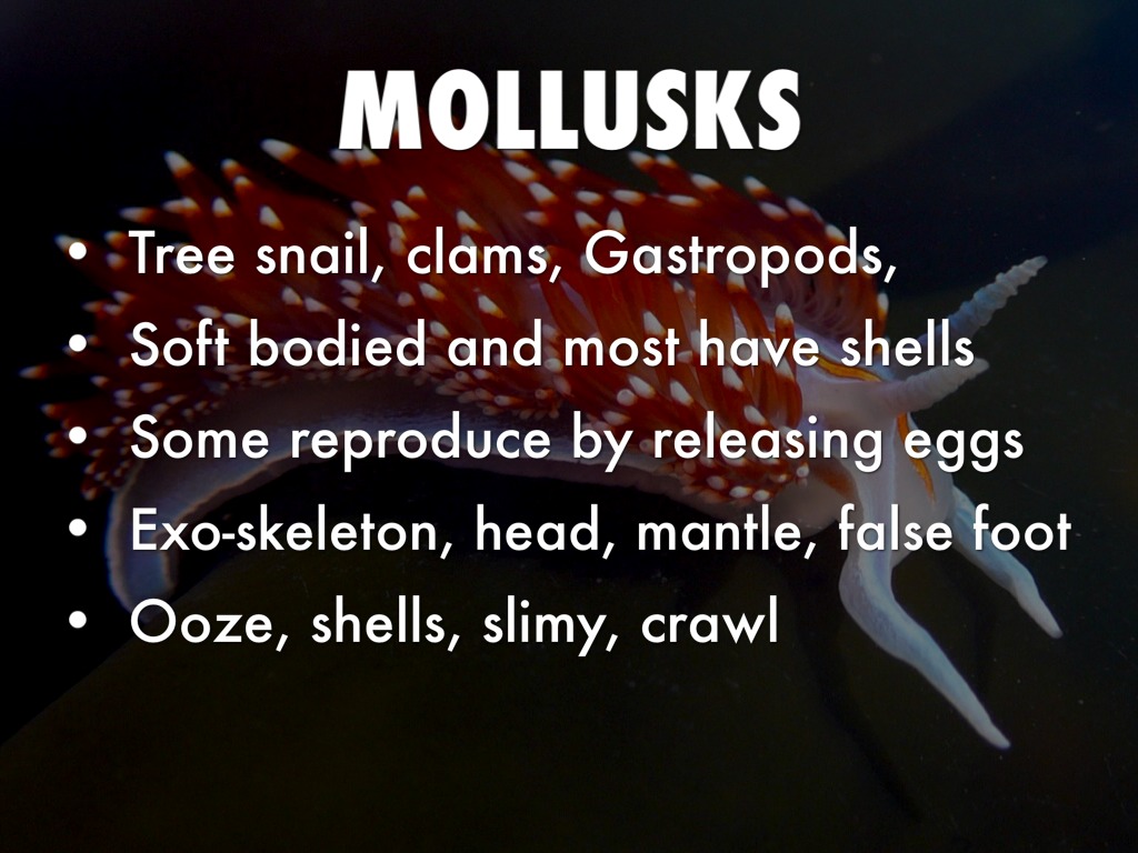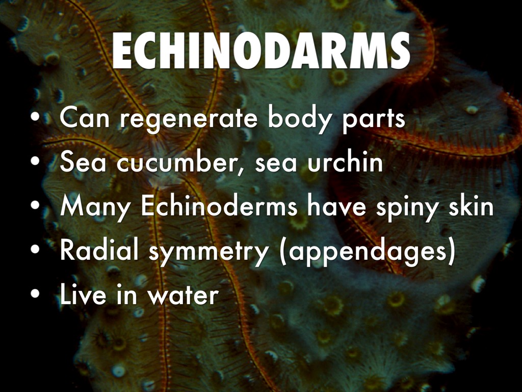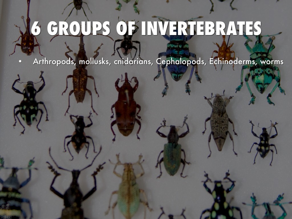 Arthropods, mollusks, cnidarians, Cephalopods, Echinoderms, worms