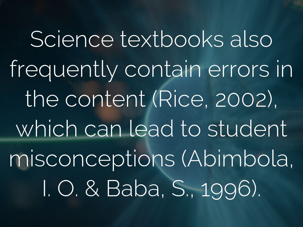 Science textbooks also frequently contain errors in the content (Rice, 2002), which can lead to student misconceptions (Abimbola, I. O. & Baba, S., 1996).