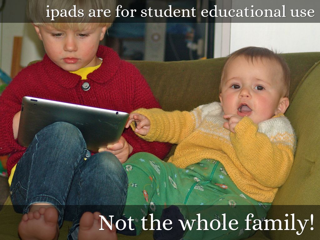 Also at home, as a parent, you should have them use the iPad in a central location and not their bedrooms so you can keep an eye on their activity to ensure they are using the iPad appropriately. At school we have a firewall and filters to keep them from going to bad sites, but once they are at home it is up to you to monitor their activity.