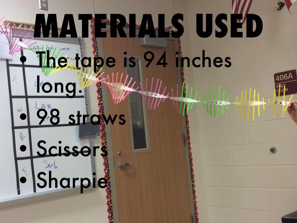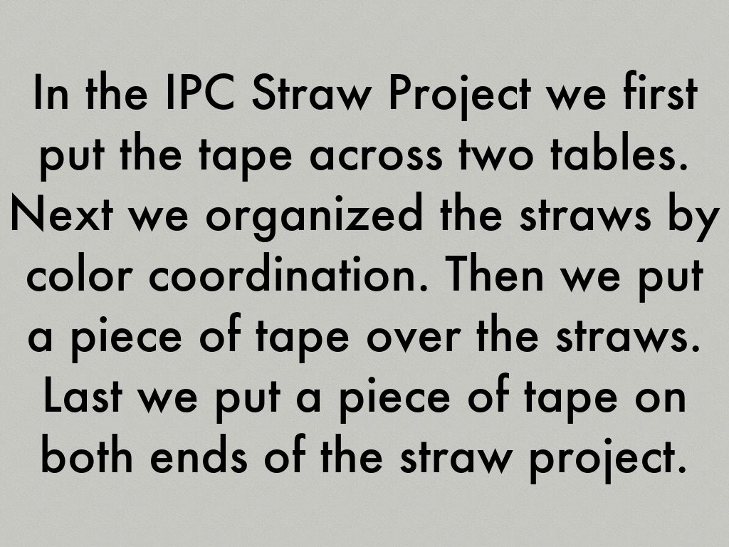 In the IPC Straw Project we first put the tape across two tables. Next we organized the straws by color coordination. Then we put a piece of tape over the straws. Last we put a piece of tape on both ends of the straw project.