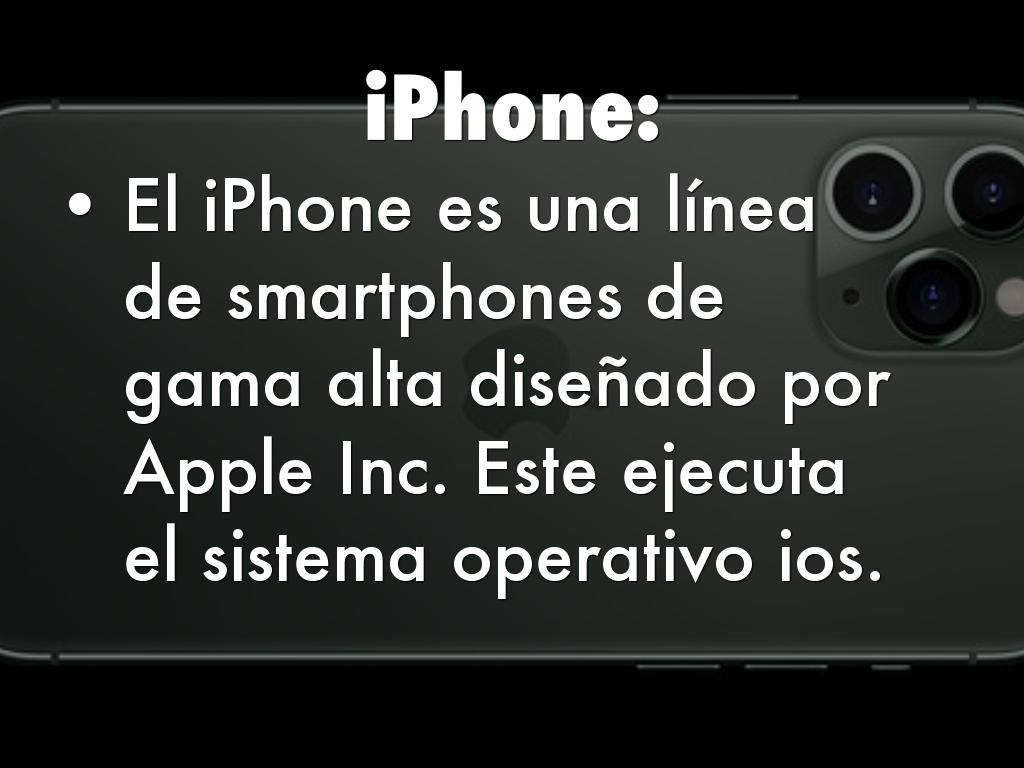 El iPhone es una línea de smartphones de gama alta diseñado por Apple Inc. Este ejecuta el sistema operativo ios.