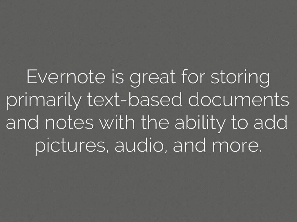 Evernote is great for storing primarily text-based documents and notes with the ability to add pictures, audio, and more.