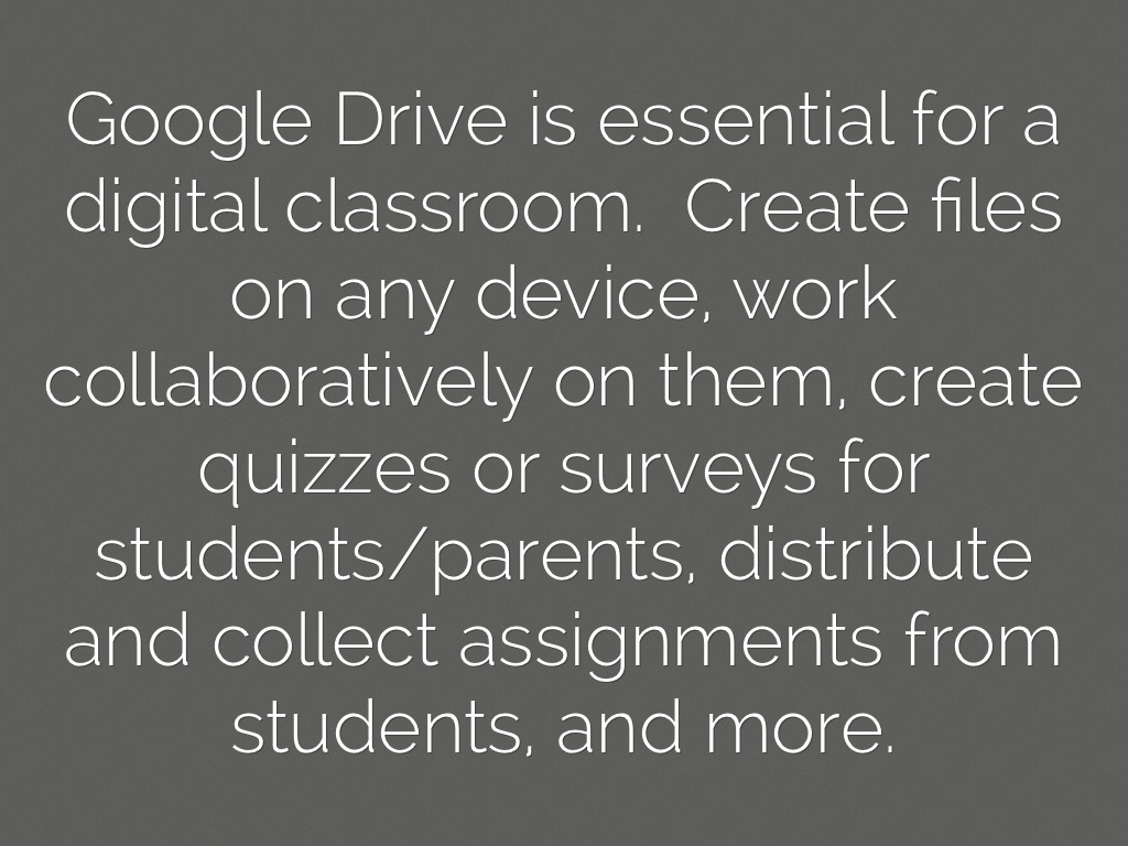 Google Drive is essential for a digital classroom. Create files on any device, work collaboratively on them, create quizzes or surveys for students/parents, distribute and collect assignments from students, and more.