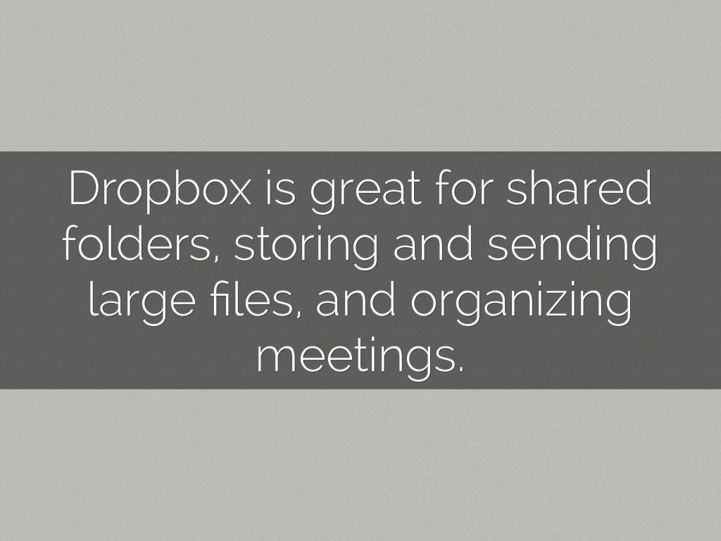 Dropbox is great for shared folders, storing and sending large files, and organizing meetings.