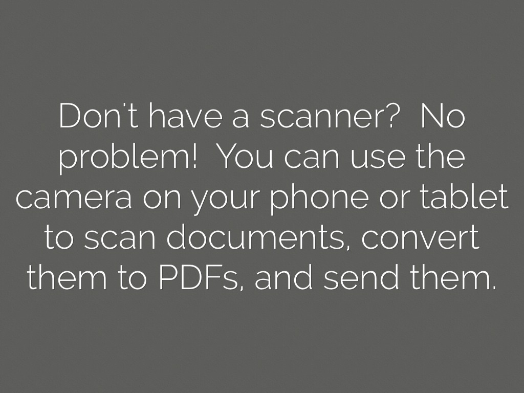 Don't have a scanner? No problem! You can use the camera on your phone or tablet to scan documents, convert them to PDFs, and send them.