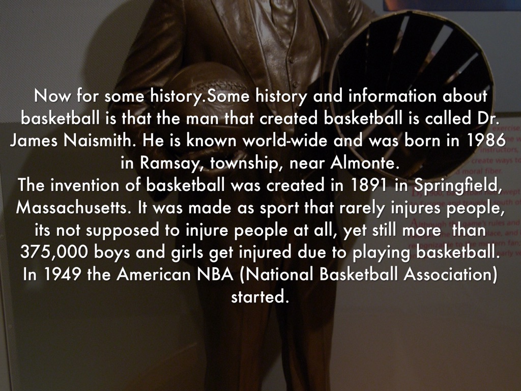 Now for some history.Some history and information about basketball is that the man that created basketball is called Dr. James Naismith. He is known world-wide and was born in 1986 in Ramsay, township, near Almonte. The invention of basketball was created in 1891 in Springfield, Massachusetts. It was made as sport that rarely injures people, its not supposed to injure people at all, yet still more than 375,000 boys and girls get injured due to playing basketball. In 1949 the American NBA (National Basketball Association) started.