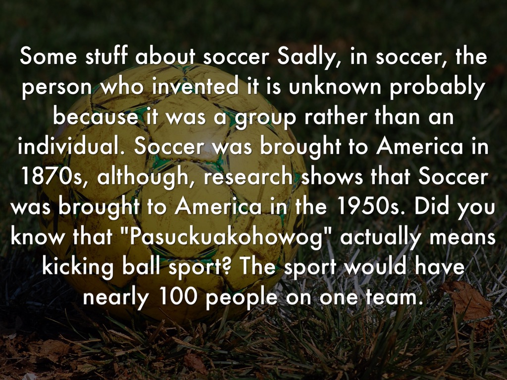 Some stuff about soccer Sadly, in soccer, the person who invented it is unknown probably because it was a group rather than an individual. Soccer was brought to America in 1870s, although, research shows that Soccer was brought to America in the 1950s. Did you know that "Pasuckuakohowog" actually means kicking ball sport? The sport would have nearly 100 people on one team.
