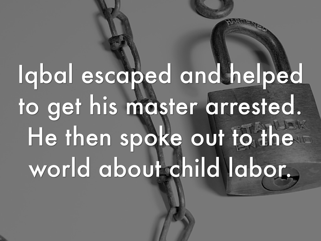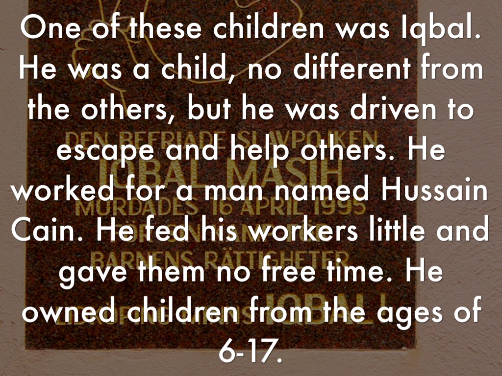 One of these children was Iqbal. He was a child, no different from the others, but he was driven to escape and help others. He worked for a man named Hussain Cain. He fed his workers little and gave them no free time. He owned children from the ages of 6-17.