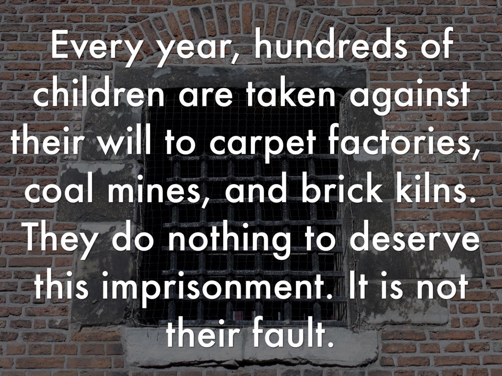 Every year, hundreds of children are taken against their will to carpet factories, coal mines, and brick kilns. They do nothing to deserve this imprisonment. It is not their fault.