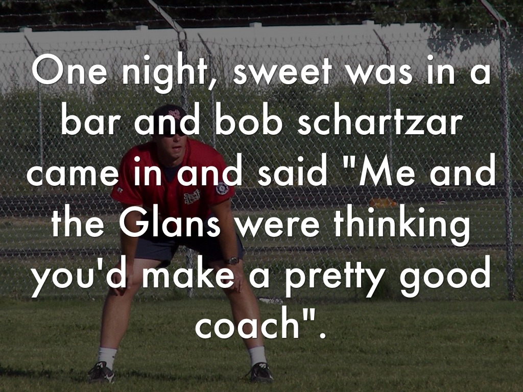 One night, sweet was in a bar and bob schartzar came in and said "Me and the Glans were thinking you'd make a pretty good coach".