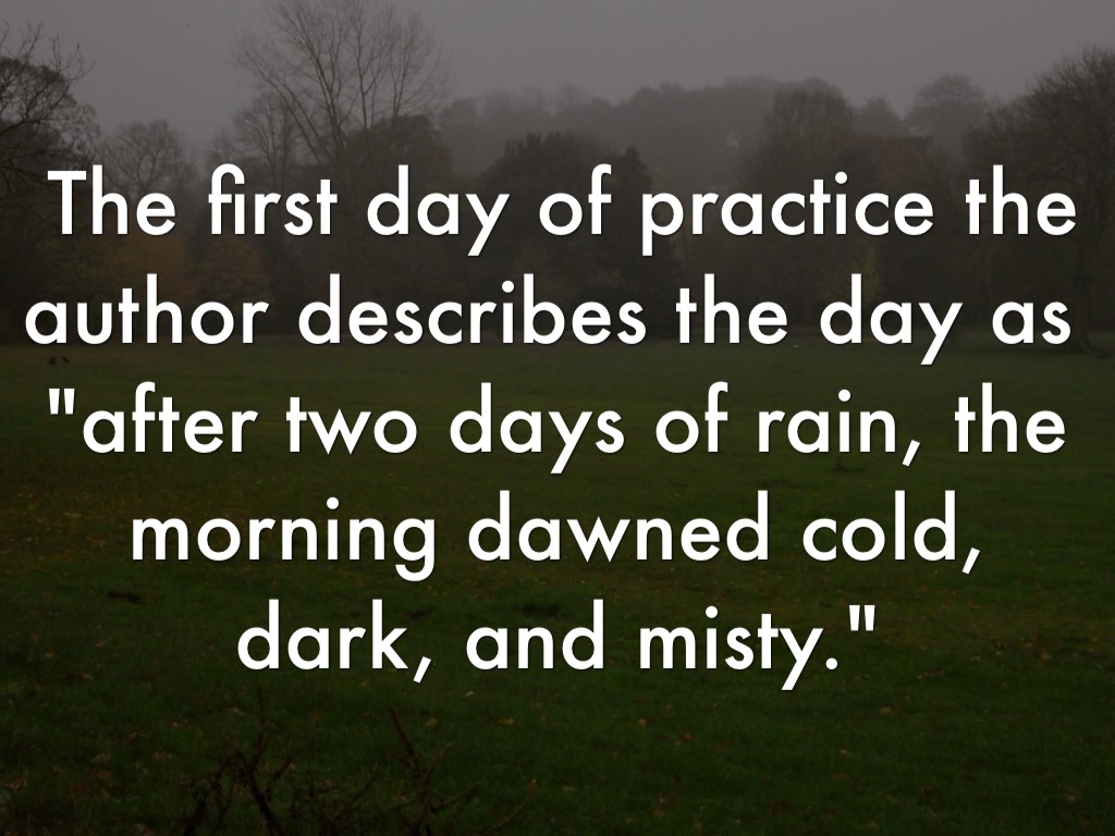 The first day of practice the author describes the day as "after two days of rain, the morning dawned cold, dark, and misty."