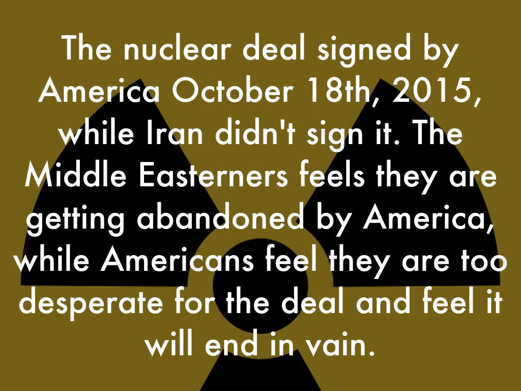 The nuclear deal signed by America October 18th, 2015, while Iran didn't sign it. The Middle Easterners feels they are getting abandoned by America, while Americans feel they are too desperate for the deal and feel it will end in vain.