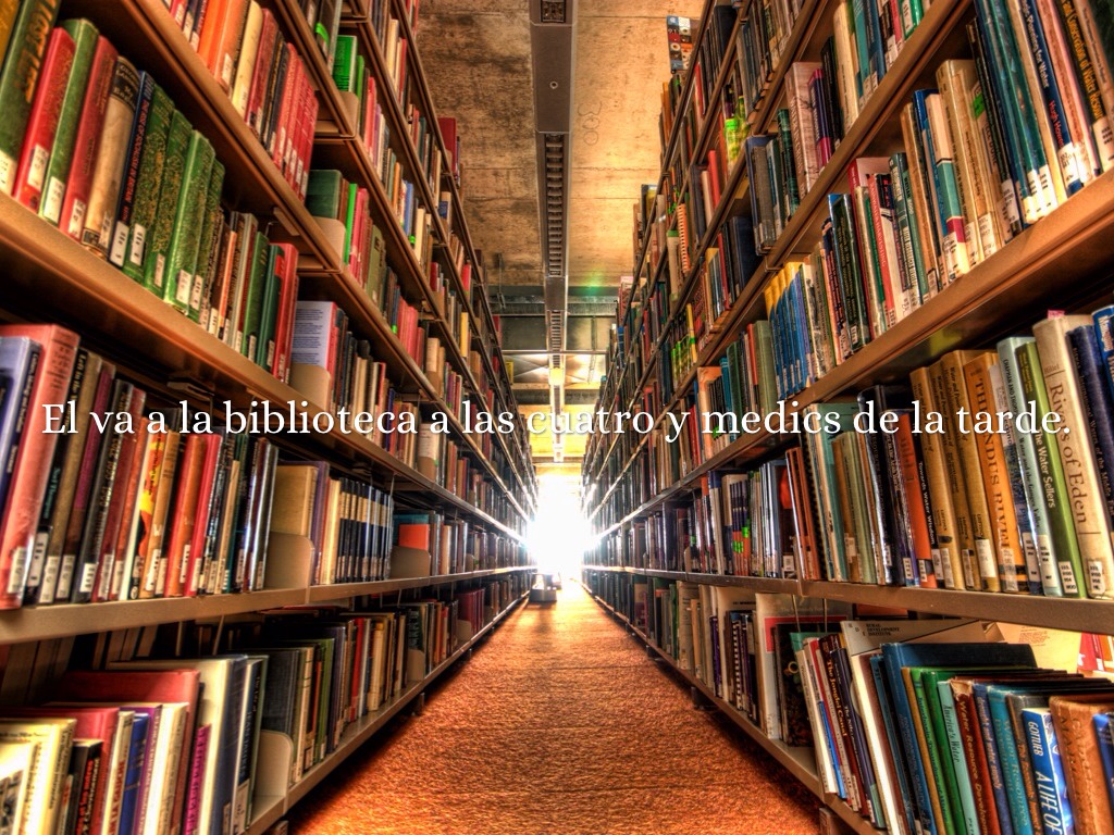 El va a la biblioteca a las cuatro y medics de la tarde.