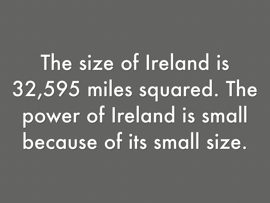 The size of Ireland is 32,595 miles squared. The power of Ireland is small because of its small size.