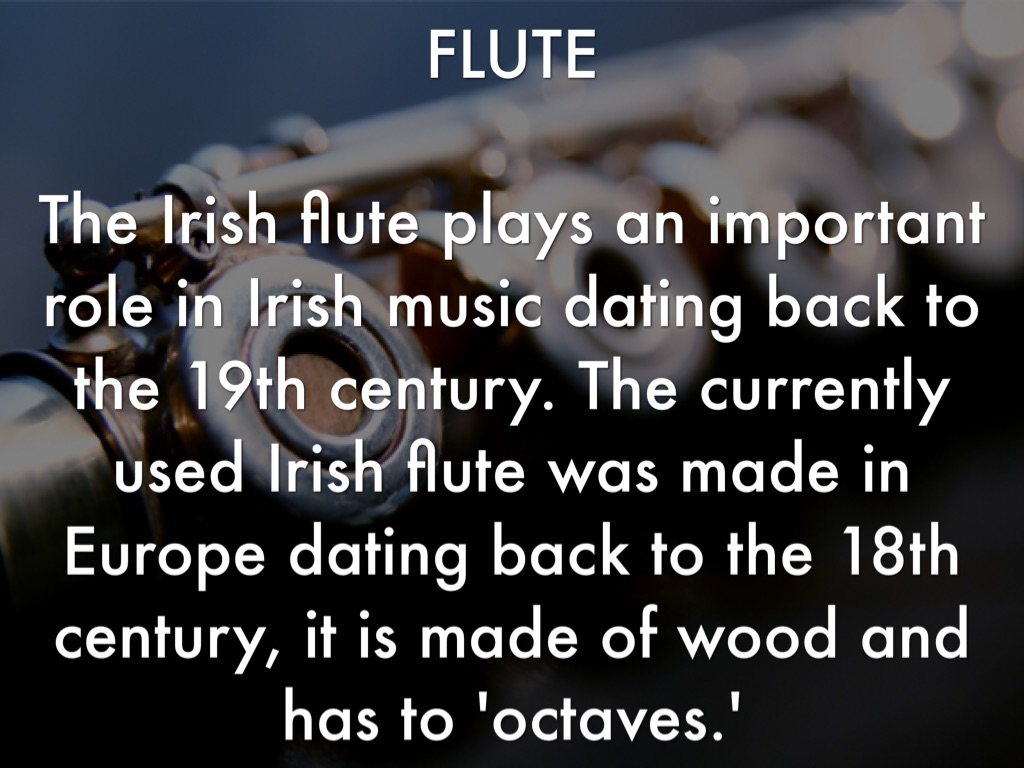 The Irish flute plays an important role in Irish music dating back to the 19th century. The currently used Irish flute was made in Europe dating back to the 18th century, it is made of wood and has to 'octaves.'