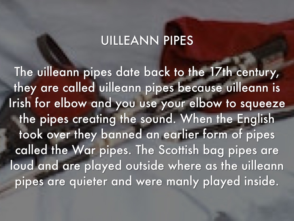The uilleann pipes date back to the 17th century, they are called uilleann pipes because uilleann is Irish for elbow and you use your elbow to squeeze the pipes creating the sound. When the English took over they banned an earlier form of pipes called the War pipes. The Scottish bag pipes are loud and are played outside where as the uilleann pipes are quieter and were manly played inside.