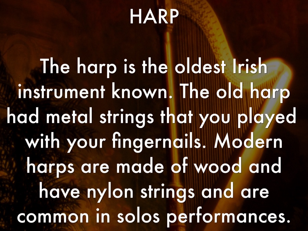 The harp is the oldest Irish instrument known. The old harp had metal strings that you played with your fingernails. Modern harps are made of wood and have nylon strings and are common in solos performances.