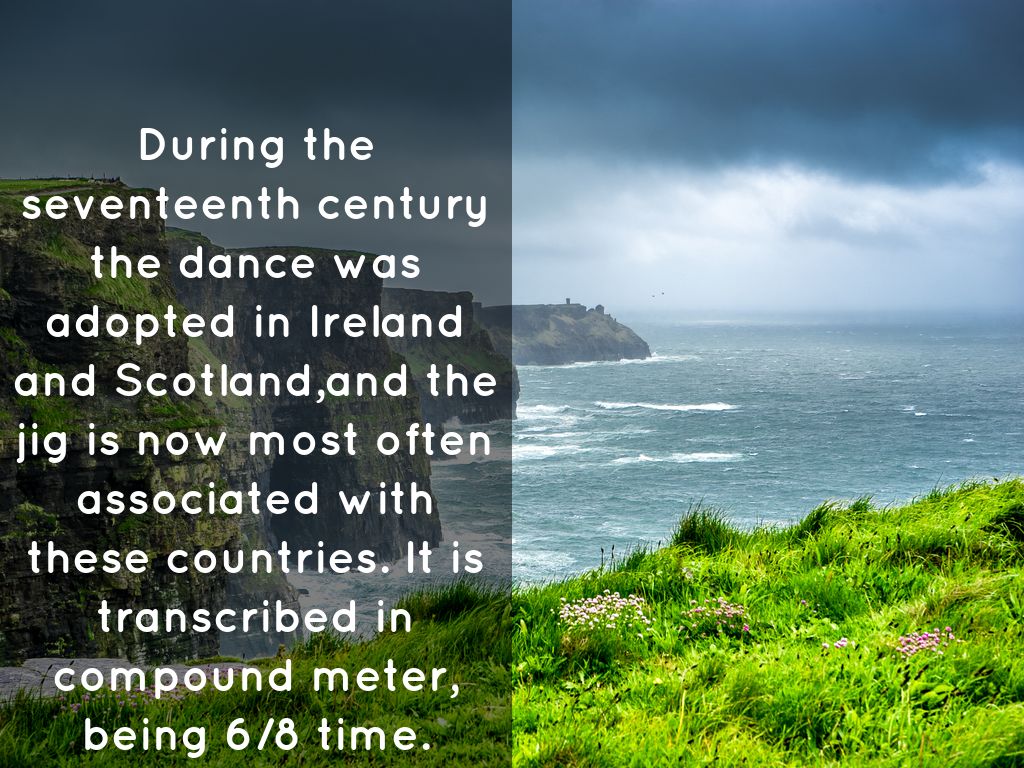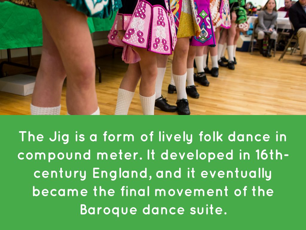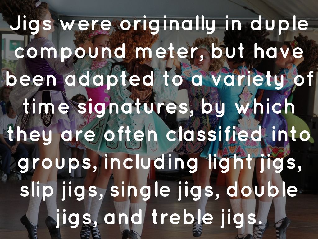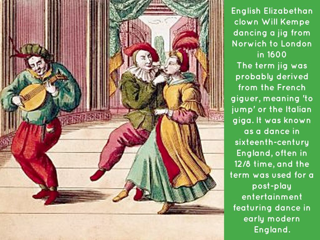 The term jig was probably derived from the French giguer, meaning 'to jump' or the Italian giga. It was known as a dance in sixteenth-century England, often in 12/8 time, and the term was used for a post-play entertainment featuring dance in early modern England.