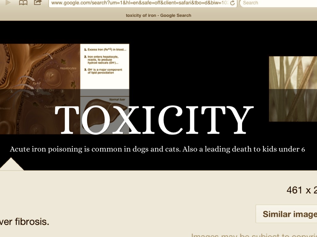 Acute iron poisoning is common in dogs and cats. Also a leading death to kids under 6