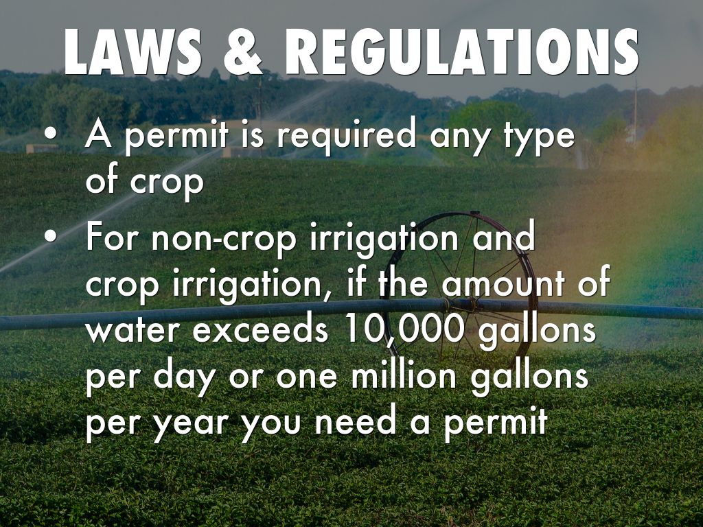 • For non-crop irrigation and crop irrigation, if the amount of water exceeds 10,000 gallons per day or one million gallons per year you need a permit