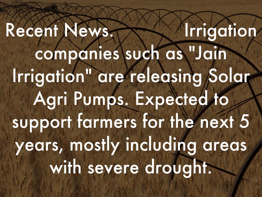 Recent News. Irrigation companies such as "Jain Irrigation" are releasing Solar Agri Pumps. Expected to support farmers for the next 5 years, mostly including areas with severe drought.